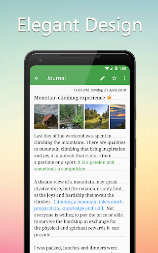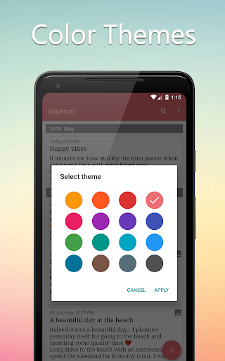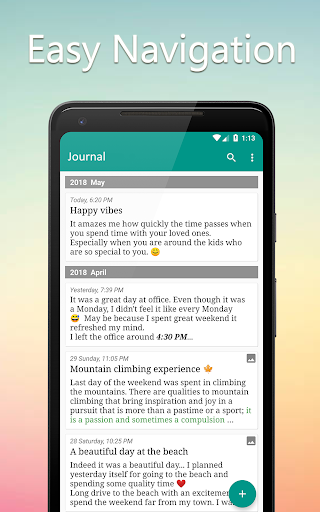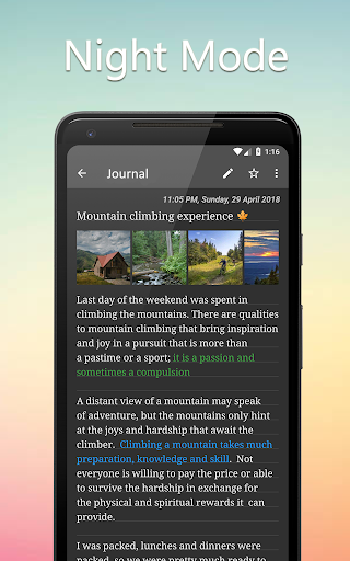 comes with inbuild lock containing pin/password/pattern & fingerprint lock options. You can always be safe of the journal you write in it. With backup & restore feature you can never lose the data when you migrate to other devices. Colorful themes & night mode is present to make the app customizable to your taste.
