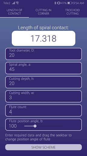 The application allows you to calculate the length of the cutting edge in contact for end mills depending on the parameters of the cutter, cutting width, cutting depth and the angle of rotation of the cutter around its axis.
