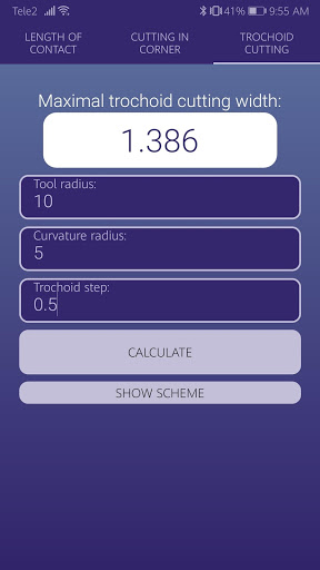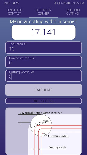 Attention: when the cutter enters the internal corners and radii, the contact length will differ from the calculated one. To calculate the maximum take-off width in the corners and for the trochoid, use the appropriate tabs. The tabs are equipped with graphical diagrams explaining the meaning of the entered values.