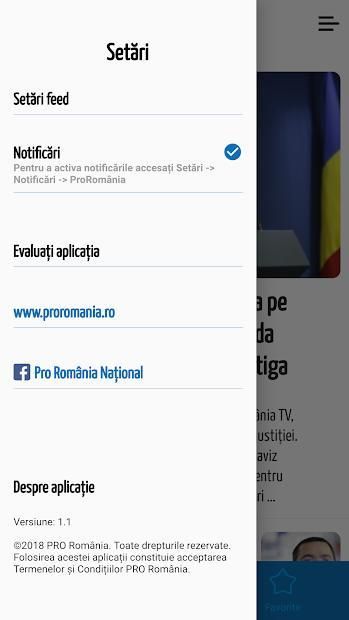 The application uses a simple interface in which users can navigate easily to set their preferences and provides the option to receive notifications for each new news according to preference settings. Users can change the notification settings from the application at any time by going to the Settings / Notifications / ProRomania section of the phone menu, thus enjoying a pleasant user experience.