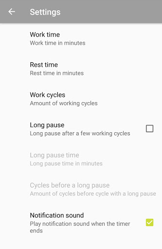 Set intervals for work and rest (or use default 45 15 minutes), set long pause (if you need it), choose a short notification signal, long alarm signal or don't use any signal at all. You can add vibration to any of these signals.