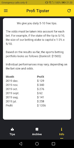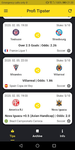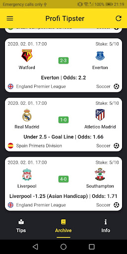 Our Sports Betting Tips app give you daily 5-10 free sports picks and game predictions in Football, Tennis, Basketball and Ice Hockey. By using our Profi Tipster app, you can get daily tips with a high success rate.