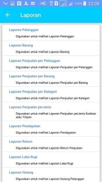 4. Laporan digunakan untuk melihat laporan barang, pelanggan, penjualan, penjualan perjenis, penjualan perpelangpan, laporan laba rugi, laporan hutang, laporan retur penjualan.
