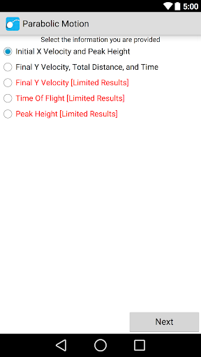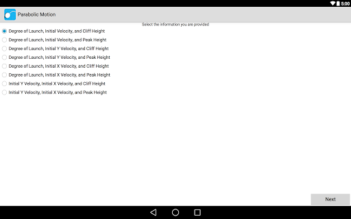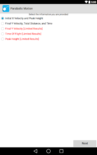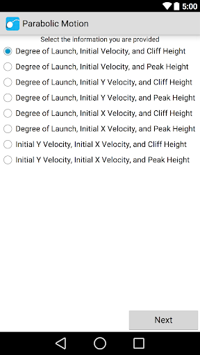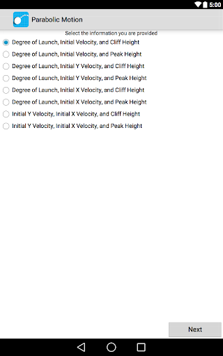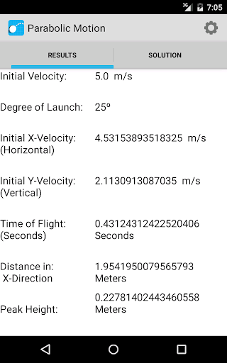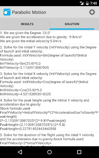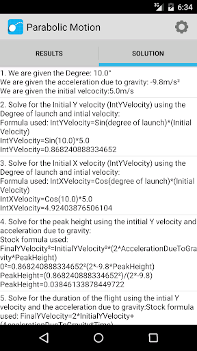 Solve your parabolic motion in over 15 different situations. This app helps you calculate and estimate answers based on the information you have inputed. The application also displays an image with the overall information and even contains a step by step analysis that explains how to solve and compute for various factors such as total distance, time and peak height. The app shows you how to solve the problem using kinematics equations.