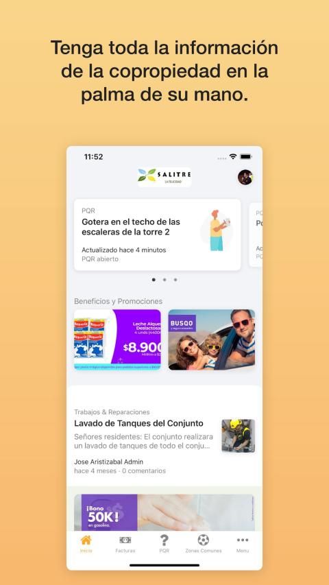 Con Propiedata tendrá en la palma de su mano todo lo que necesita en su copropiedad. Podrá pagar su administración, enterarse de noticias y eventos, publicar anuncios, reservar zonas comunes, autorizar el ingreso de visitantes, hacer solicitudes directamente al administrador, participar en votaciones y tener acceso a los documentos publicados por la administración.