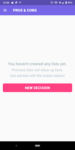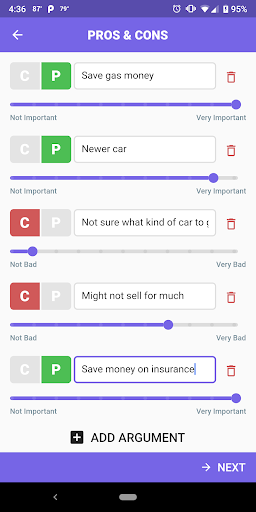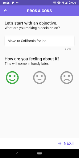 Simply download the app, create a situation you need help with and enter your pros and cons. Each pro and con will have an importance factor (0-10) we will ask for, which helps in the decision making process.