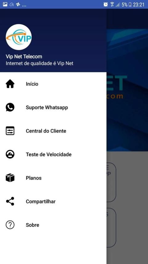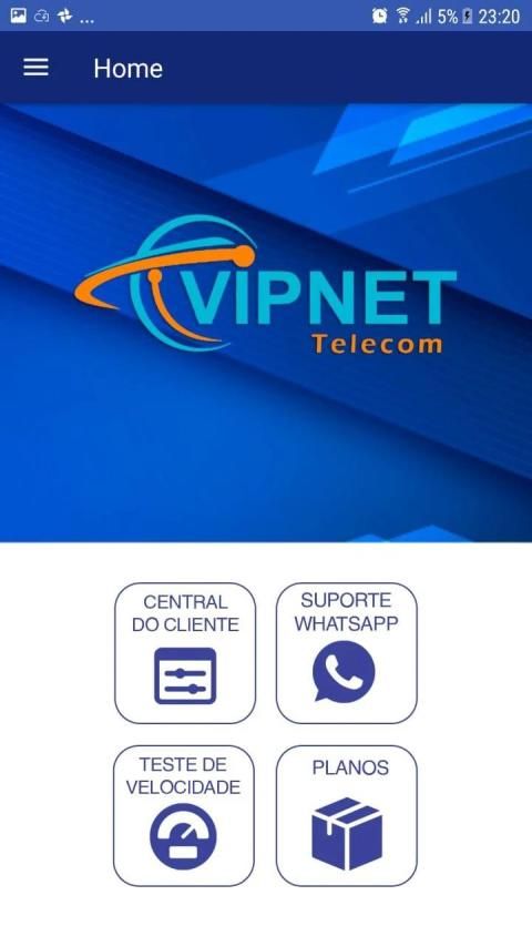Novo aplicativo Vip Net Telecom. Cental do Cliente, Suporte Whatsapp, Planos e Teste de Velocidade em um app rápido e fácil.