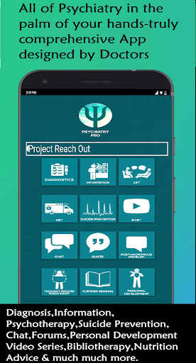 Psychiatry PRO-Project Reach Out is a free Mental Health App that is akin to having your own Personal Psychiatrist & Psychotherapist all rolled up into one and available to you anywhere anytime.Mental health,wellness & well-being made easy & free.
