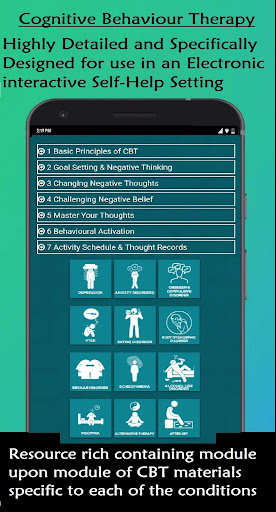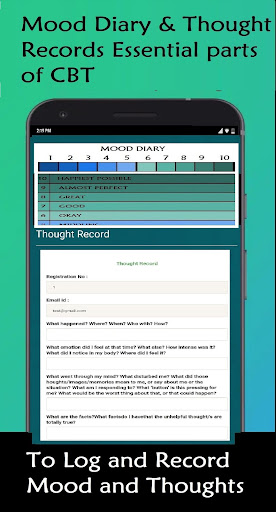 App includes a Mood & Thought Record Diary which are essentially parts of CBT & help in recognizing Negative Automatic Thoughts and then subsequently changing theses & core-beliefs,behaviors and feelings in-turn.