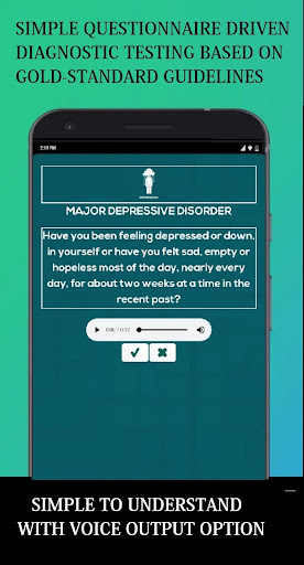 Screening Psychiatric Interview Tests based upon the Diagnostic & Statistical Manual of Mental Disorders (DSM-5) similar to a real-world Psychiatric Assessment. This Comprehensive Diagnostic Screening tool currently tests disorders such as Depression,Anxiety disorders,Panic Attacks,Social Anxiety, Phobias, Obsessive Compulsive Disorder (OCD),Post traumatic Stress Disorder (PTSD),Body dysmorphia,Eating disorders,Anorexia & Bulimia nervosa, Binging & Purging,Bipolar disorder including Mania & Hypomania,Schizophrenia & Psychosis, Insomnia,Self harm & Suicidality,Borderline or Emotionally Unstable Personality disorder & Antisocial Personality Disorder,Alcohol Addiction & Substance Abuse etc