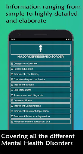 The App provides a Library of Professional level Information about Prevalence,Incidence,Pathogenesis,Prognosis & Treatment of Psychiatric Disorders.Knowledge and awareness instill a less negative approach to mental health problems and improves Treatment Outcomes..