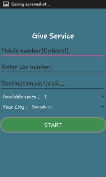 Give service: Person Using car may give car pool service to the person want to go in same route. Service provider will give their destination & Via (optional).