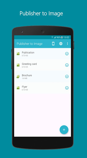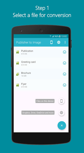 Convert your Microsoft Publisher (.pub) files into JPG images right on your Android device or Chromebook. Ideal for when you receive publications in the .pub format and can’t open them. Easily and quickly convert Publisher files from anywhere on your device, Dropbox, Google Drive, Box and OneDrive. The newly converted file will be downloaded to your device. Edit and share your document with anyone.