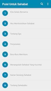 Ini merupakan aplikasi kumpulan puisi untuk sahabat. Dengan menggunakan aplikasi puisi untuk sahabat ini Anda dapat dengan mudah membaca dan menshare ke sahabt Anda. Tampilan Aplikasi ini juga cukup sederhana namun menarik.