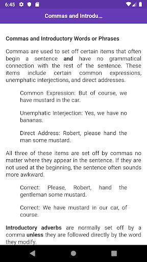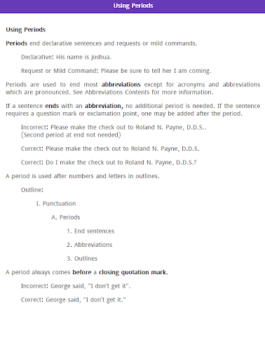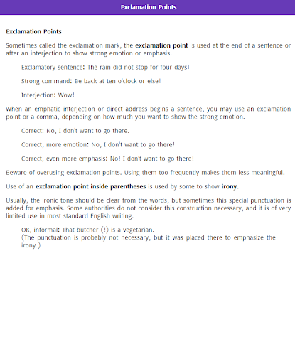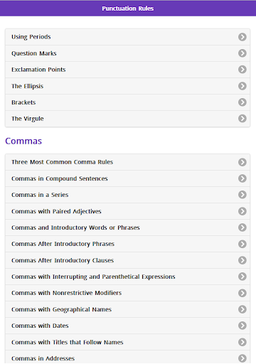 Punctuation is used to create sense, clarity and stress in sentences. You use punctuation marks to structure and organise your writing. You can learn usages of Punctuation Rules, Spacing, Periods, Commas, Semicolons, Colons, Quotation Marks, Parentheses and Brackets, Apostrophes Hyphens, Dashes, Ellipses, Question Marks, Exclamation Points, Slashes from this app.
