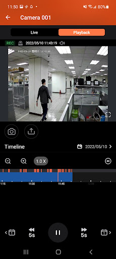 - Supports switching instantly between the Live and Playback modes and clicking the timeline to play back recordings from a specific moment.
