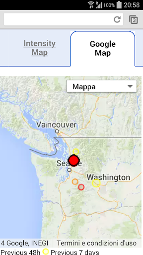 A MAP button is available in order to see the earthquakes on a map with colored markers and info baloons (ML, datetime).