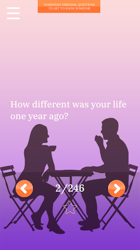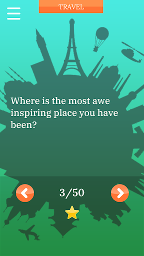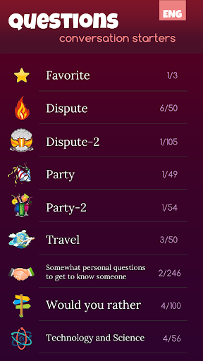 "Questions. Сonversation starters"- the name speaks for itself. There are сonversation starters both for the company and for more personal meeting. If in the company of friends it becomes suddenly boring for you, you can always use our application, questions will help to recognize your friends and acquaintances from the new party. At present the following subjects are available: