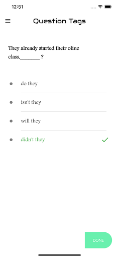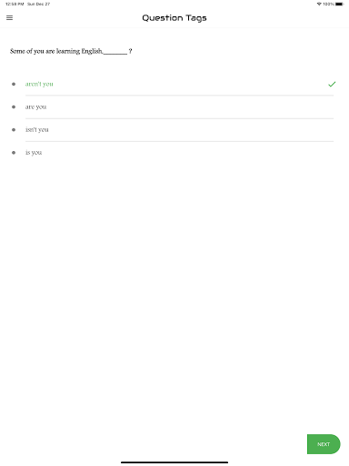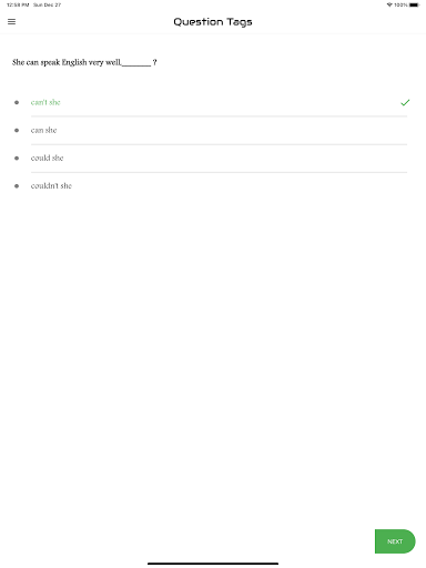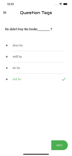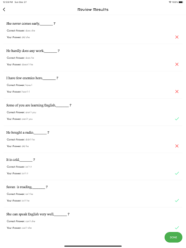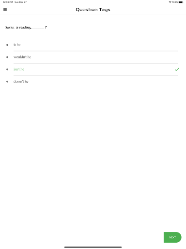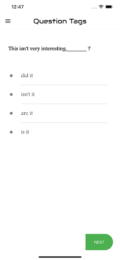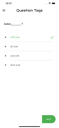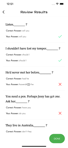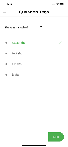 The aim of this app is to introduce you to the basic concepts of the grammar item "Question Tag ". The app features the interactive exercises based on it. It will enable you to learn the skills needed for analyzing Question Tag. It will help you write any kinds of questions at various levels. Each test will help you to improve your knowledge greatly. Learners introduce here are for all levels. That means basic, intermediate and advanced learners. We have practice exercises where you can answer Tag Questions and get scores. There are lots and lots of questions to practice. You can analyze your test results also and check which are correct and which are wrong. This app designed to help you master over Question Tag..