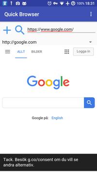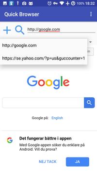 Quick Browser is a fast, simple and quick browser for Android. It's intended to be easy, simple and as light as possible with the minimum features. Simply navigate your favorite sites in the Dropdown list or remove any favorites from the list by long tapping.