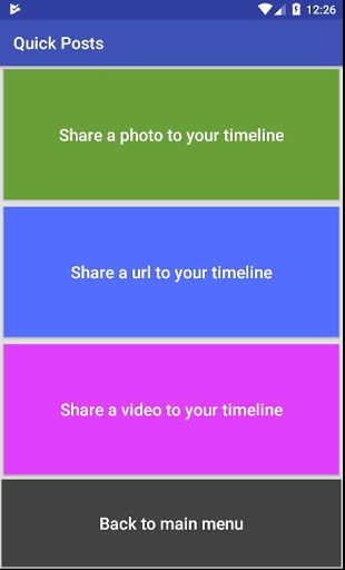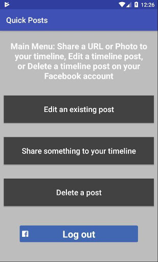 Facebook Quick Posts is used to edit and delete the post messages from your current Facebook account. It can also be used as quick way to share a photo, video, or URL to