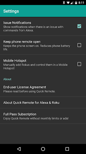 IMPORTANT: Your phone's Wi-Fi needs to ALWAYS stay on during sleep for it to receive commands from Alexa devices and send it to your Roku. Also, if your phone has trouble connecting with your Roku then turn off battery optimization for this app in Android Settings > Battery Optimization