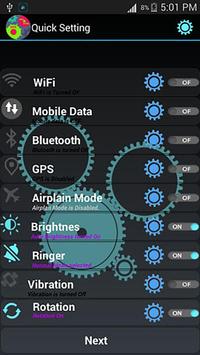Easy quick and smart settings app. This app have access to your wifi , mobile data, brightness, ringtones, Bluetooth ,