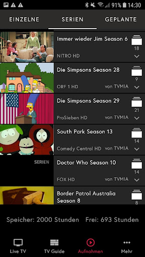 - Aufnahmen: Nehmen Sie bis zu 2'000 Stunden* Sendungen, Filme oder Serien mit Serienaufnahme auf.