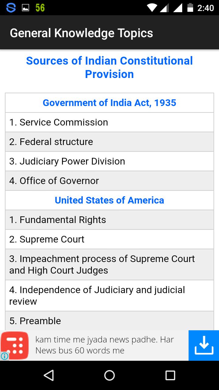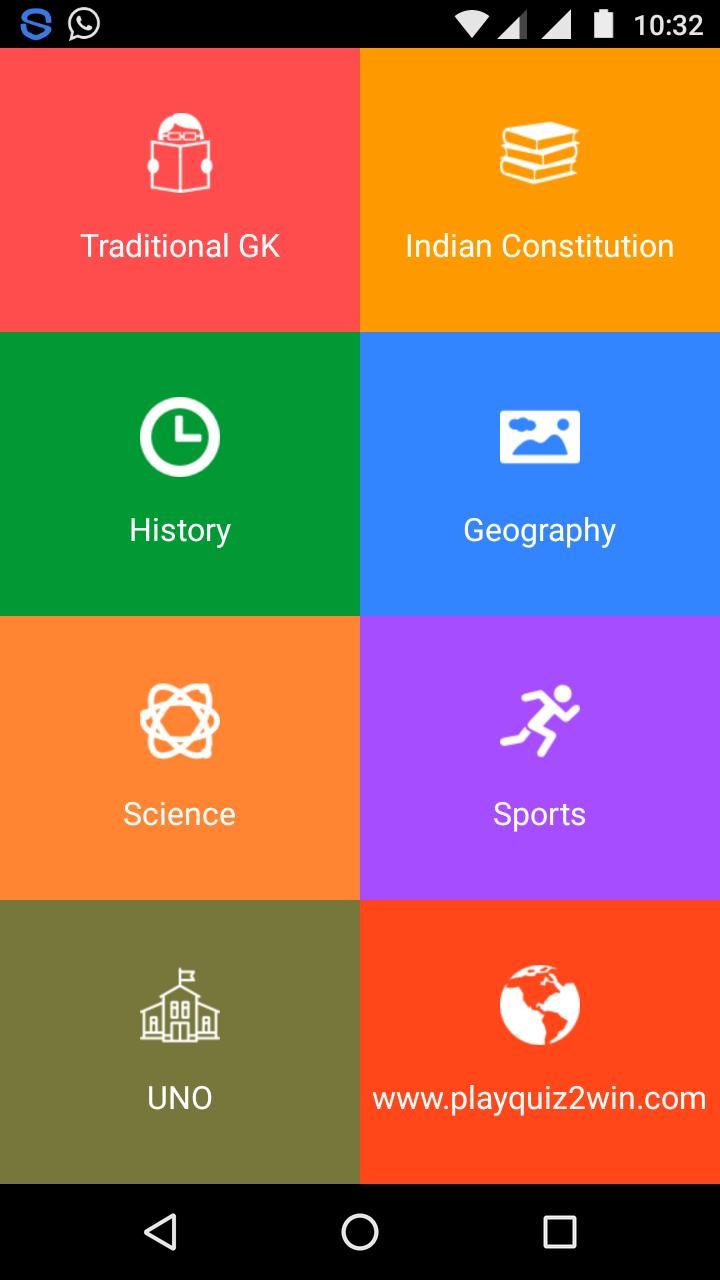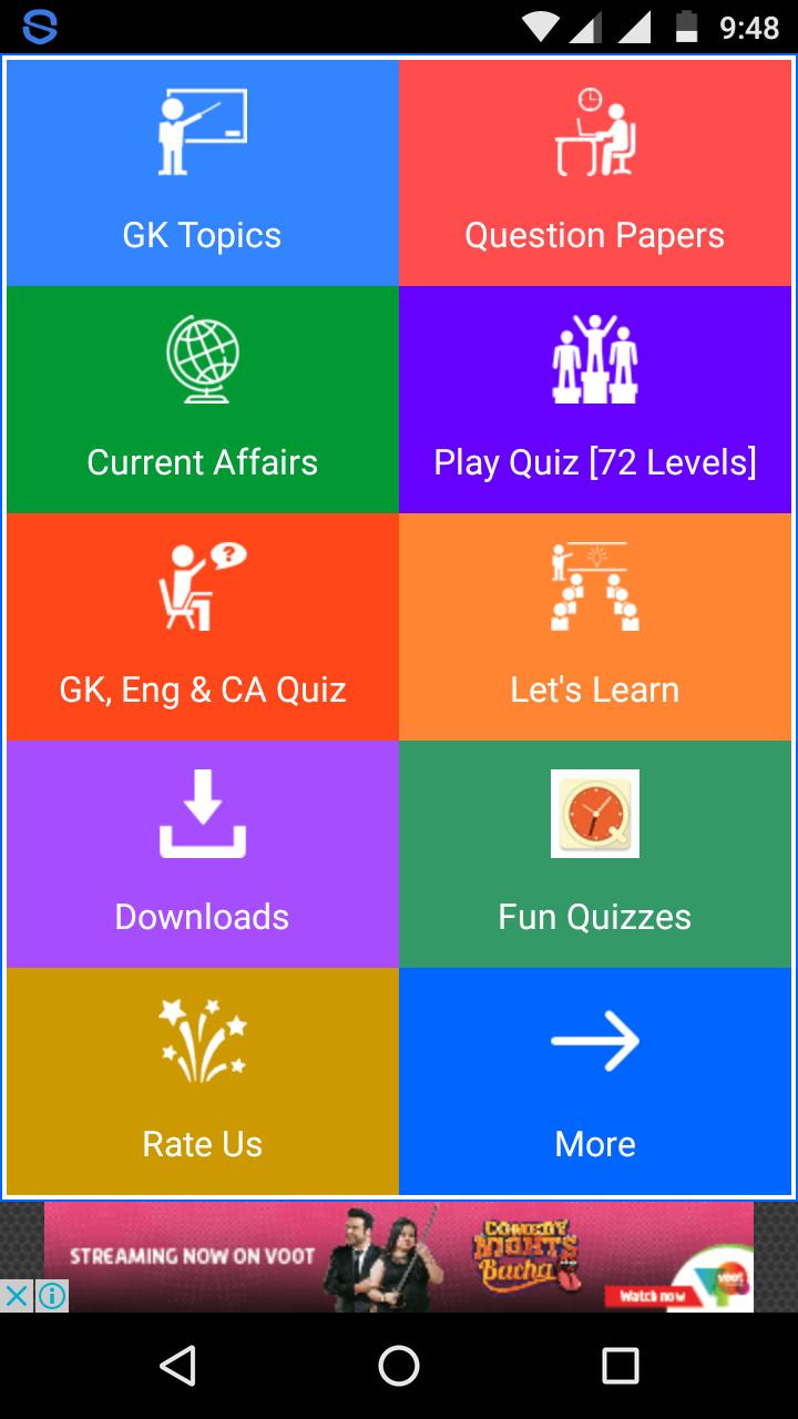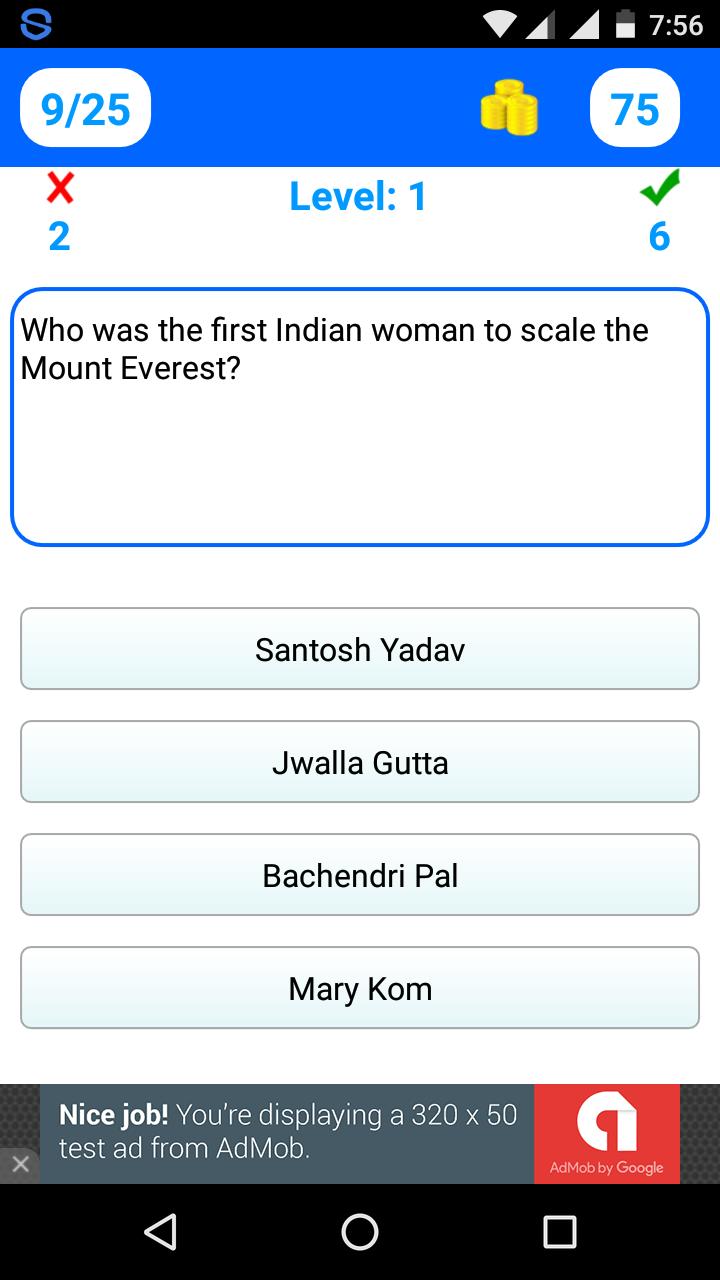 1. Play 50 levels of GK Quiz and improve your knowledge in History, Geography, Constitution, Economics, Science, etc.. Each level has 10 questions and 30 seconds to answer a question. Thus, a total of 500 General Knowledge questions are there for you to play. You have to answer all 10 questions correctly to unlock next level.
