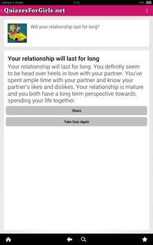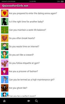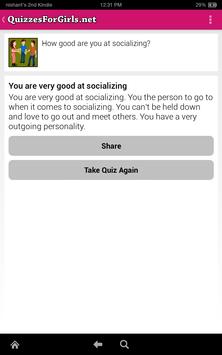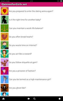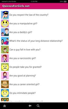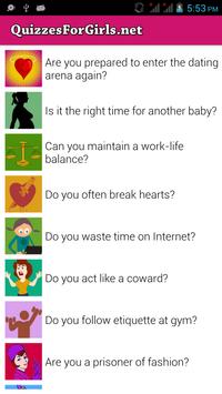 We have 210 quizzes for girls in this application. These quizzes are for girls. We have personality quizzes, love quizzes, relationship quizzes, fashion quizzes etc. for girls.