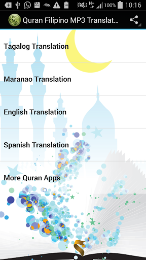 Translation of the Meanings of the Quran into Tagalog, Maranao, English and Spanish as audio file.