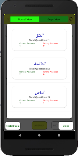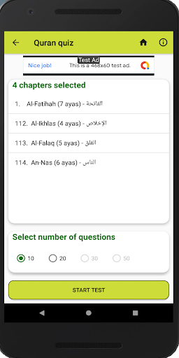 You also have the option of choosing the number of question e.g. 10, 20,30 and 50 which would be enabled depending on how many ayas are there in total from the list of chapter selected by a user.