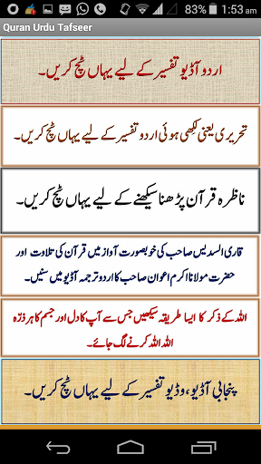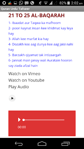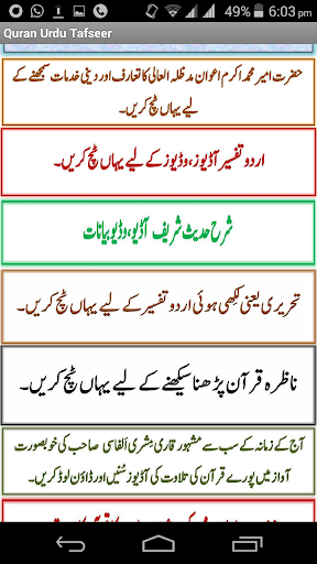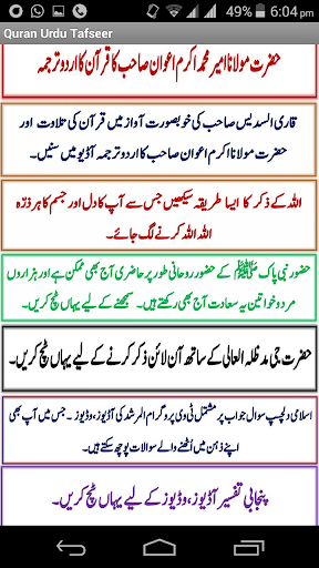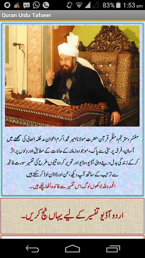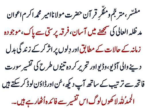 Ads free application Mirroring the website www.qurantafseer.net, this application contains Hazrat Maulana Ameer Muhammad Akram Awan's Audio, Video and Written tafseer all in one application.This application also contains Nazrah Quran learning and Quran recitation with urdu translation audios.