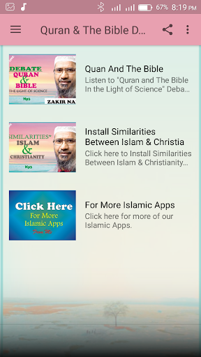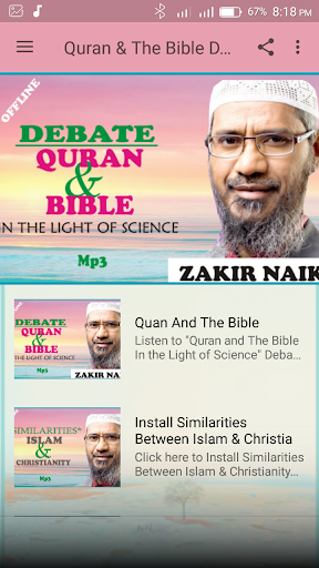 This application brought you the "Quran & The Bible in the light of science" Debate between Zakir Naik and William Campbell. The application is perfectly offline. Once you install it, you will enjoy unlimited listening to the debate for free.