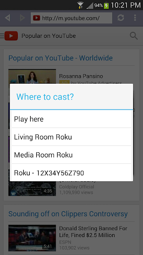 Browse the web for videos in the Android app and cast them to the Roku channel. It's that easy!