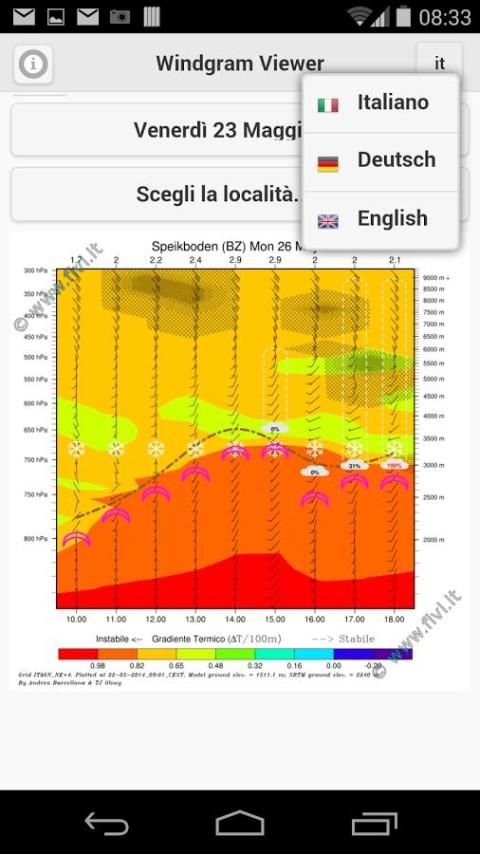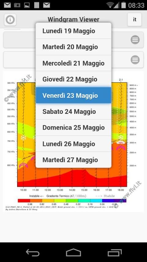 Viewer Windgram for weather forecasts available at FIVL (ASD Italian Federation of Free Flight). It should be a registration key to activate the app.