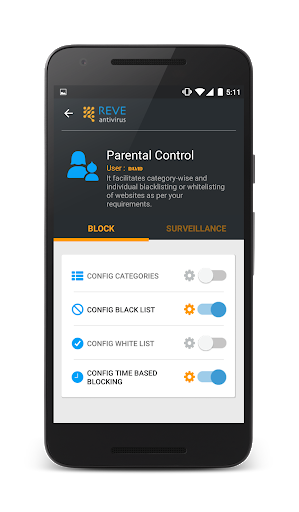 • Parental Control: Allows you to manage parental control settings of your PC from your mobile app. You can block websites on the basis of category or switch to surveillance mode and get live alerts about the online activities going on your PC.