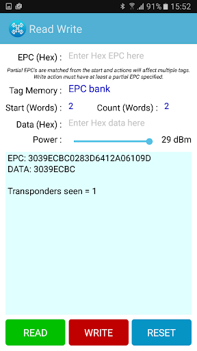 ▪ Read/Write - Inspect information stored in the memory banks of a chosen tag. Create customised tags by writing new information to a chosen tag memory bank.