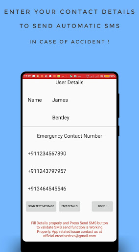 • Automatically Sends Emergency text messages along with your accurate accidental location to the contacts saved in the app.