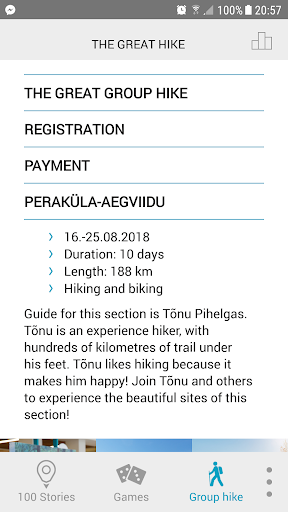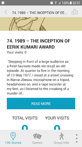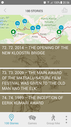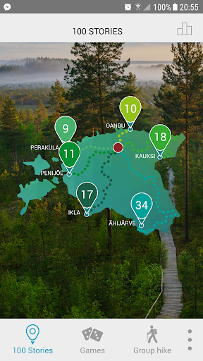 Estonian forest tells the Estonian story. For Estonias 100th anniversary we have mapped 100 stories located by RMK hiking routes. Now while hiking you can learn about the cultural and historical sites that you may otherwise pass by without noticing. Make your mark by checking in at the sites you visit, see where others are visiting and what are the most popular sites.