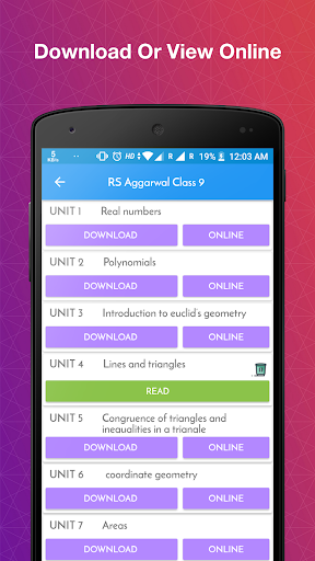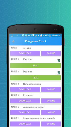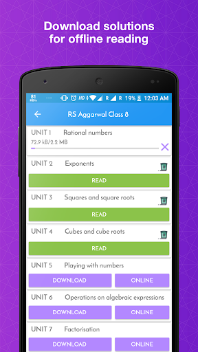 This App Contains RS Aggarwal Solutions of Class 6 , Class 7 , Class 8 , Class 9 and Class 10 . It also provides Offline mode in which No Internet is Required once the pdf has been downloaded.