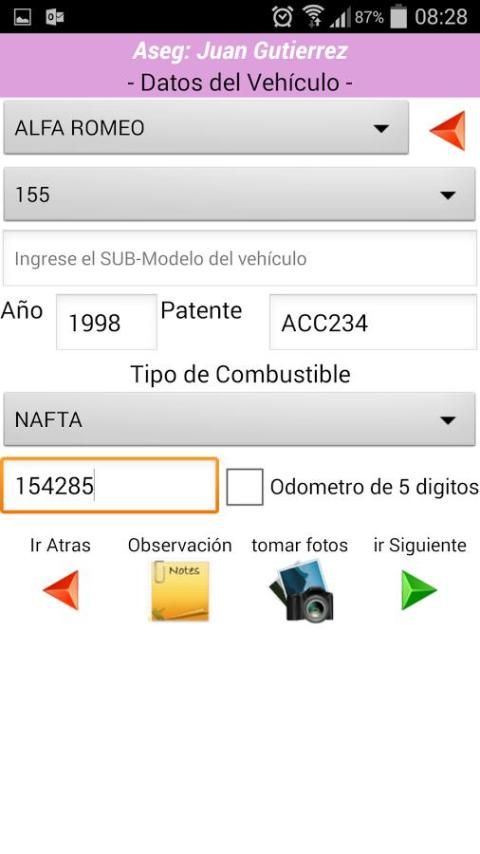 Ud. deberá cargar datos básicos del vehículo, tomar las fotos desde la misma aplicación, y una vez finalizada, automáticamente será enviada a nuestra empresa, en donde se reenviará de manera habitual a vuestra compañía.