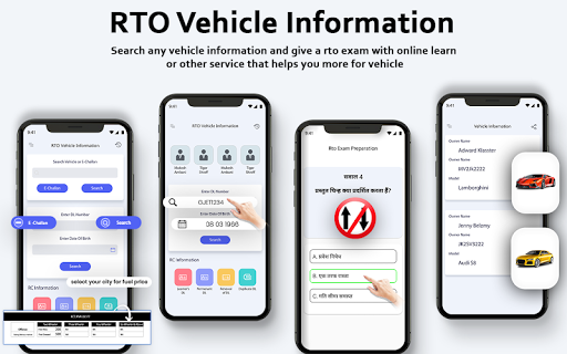 You can Find Any Indian vehicle owner details with singale click and do the preparation for the RTO examination and also give the practice exam in this application. You can check driving license information and RTO information in this app. You can check the car information by selecting a particular company and also check the most trending people's car information.
