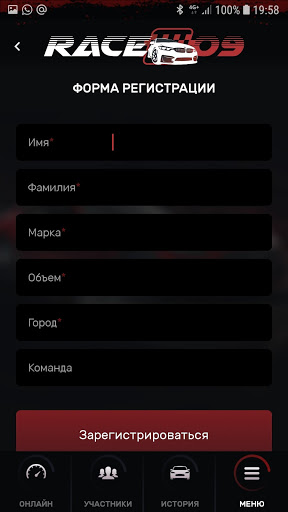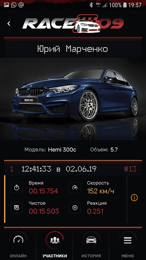 В этом меню отображаются все активные участники проходящего соревнования, после прохождения регистрации и модерации администрацией. Для просмотра всех заездов определённого участника нужно нажать на кнопку подробнее (i). Так же в этом меню доступен поиск участника по имени и марке авто.