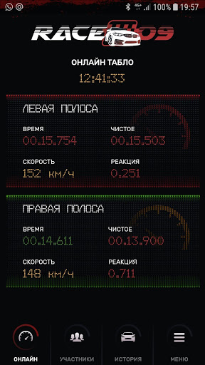 В данном меню отображаются актуальные данные последнего заезда. Зелёным цветом подсвечивается победитель. Данные обновляются автоматически с уведомлением (вибрация);