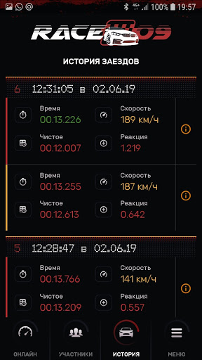 Здесь можно увидеть историю всех заездов, которые проходили на текущем мероприятии. Обновление данных в меню осуществляется свайпом вверх. Для просмотра подробной информации об участнике заезда нужно нажать на кнопку подробнее (i). Зелёным цветом подсвечивается победитель.