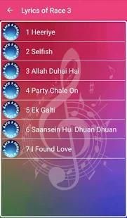 Race 3 is the Songs Lyrics applications that is suitable in your phone and it's easy to use and free for you. Everything on this application is intended only for entertainment. Just search for any movie songs lyrics and you're getting all the songs from Race 3, that you're looking for.