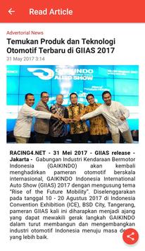 Racing4 Mobile adalah aplikasi resmi dari portal berita otomotif roda 4 : Racing4.net, hadir menjadi solusi bagi para pembaca yang ingin mendapatkan berita secara realtime dan uptodate langsung di HP Android pembaca.