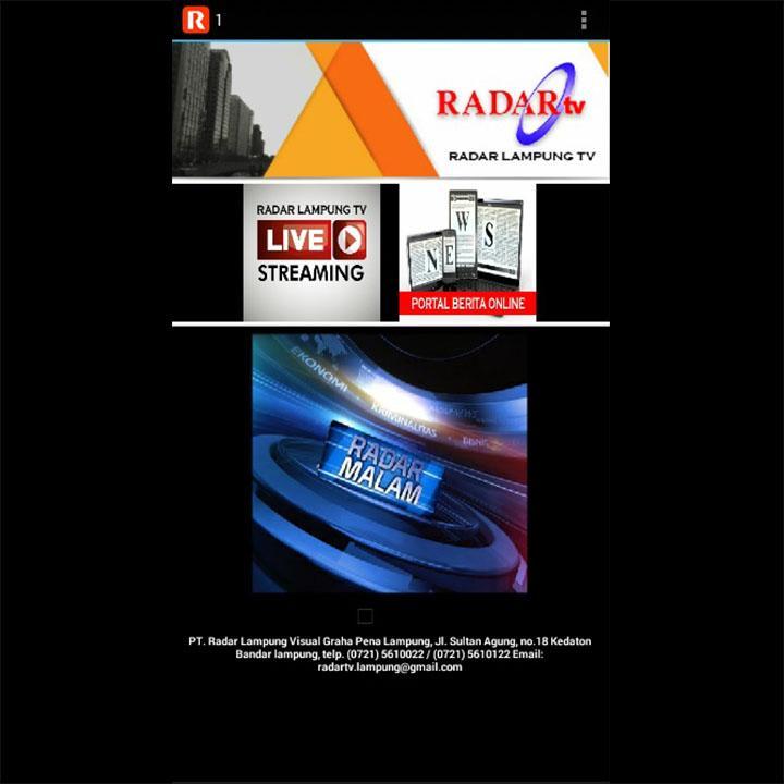 Radar TV Lampung adalah stasiun televisi lokal terbaik di provinsi Lampung. Radar TV bersiaran di analog 48 UHF dan satelit ninmedia. Radar TV memiliki portal berita online dan live streaming. Kami memberikan informasi terkini kepada anda dengan berita dan video terbaru, terlengkap dan terpercaya. Kantor : Graha Pena Lampung Jl Sultan Agung no.18 Kedaton Bandar Lampung Informasi & Iklan : (0721) 5610022 - 5610122