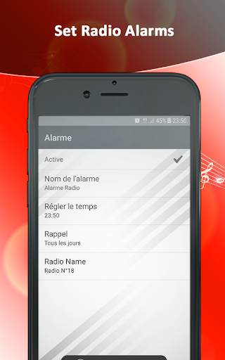 - The radio app with alarm allows you to start the alarm with your favorite radio station